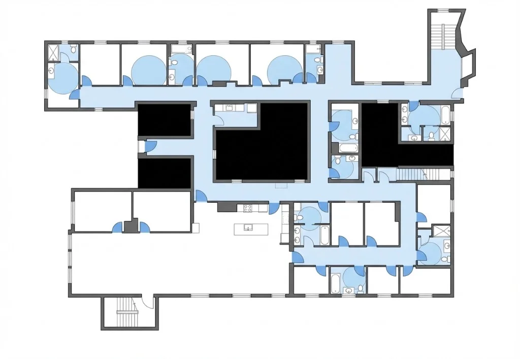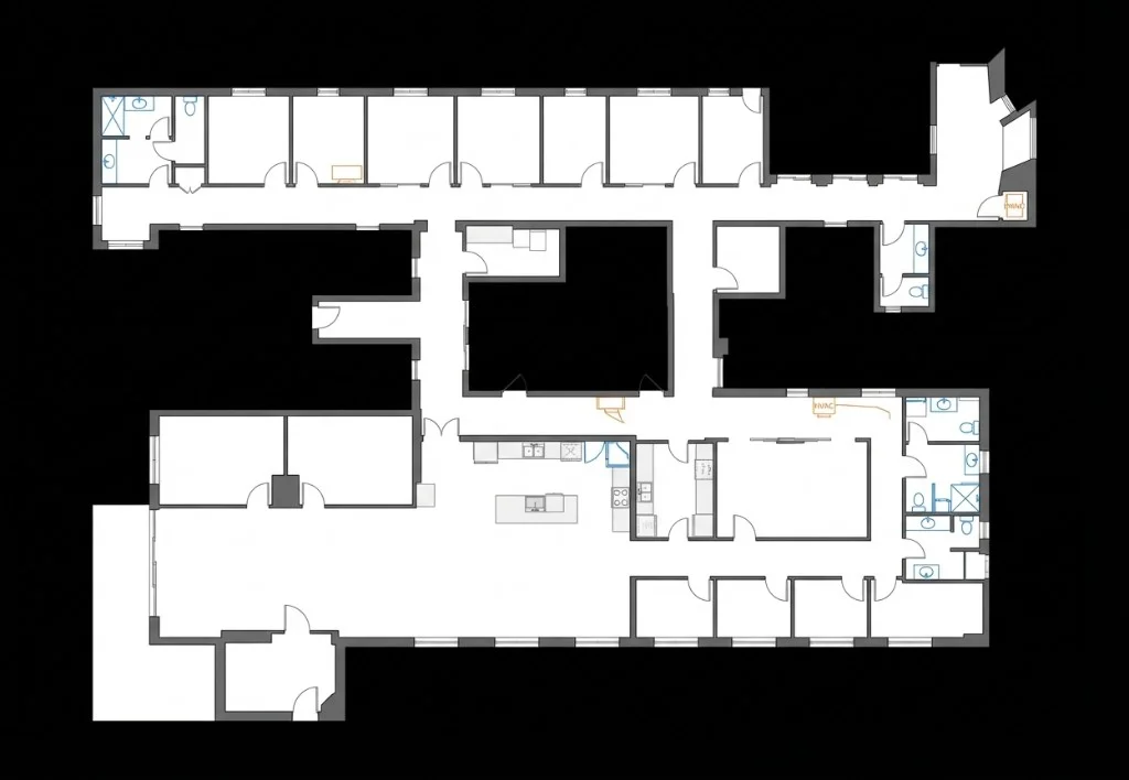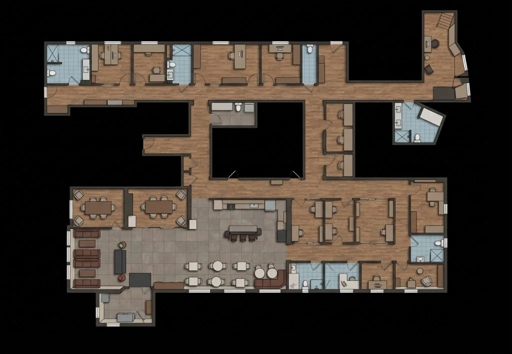 機能別に色分けされた部屋—キッチン、バス、オフィスなど。インテリアデザイナー、テナントフィットアウト、オフィスプランナー向け。