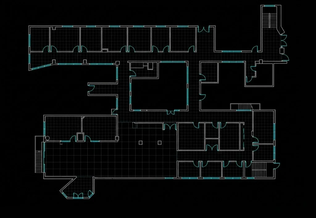 黒背景に白/シアンのラインによる技術的 CAD 図面。建設ドキュメントとファシリティマネジメントのスタンダード。